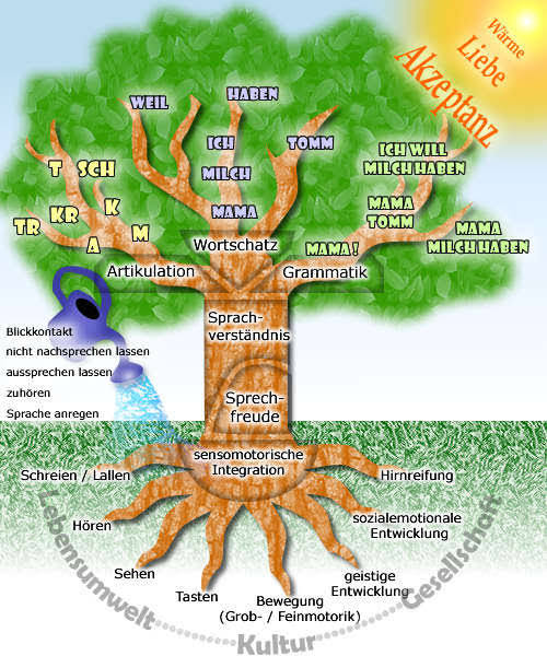 - 3 bis 4 Jahre (Ausbau der Sprache): Sätze werden länger und komplexer. Viele Laute, wie w, f, k, t, werden beherrscht, während schwierigere Zischlaute (s, sch) noch in Entwicklung sein können.
