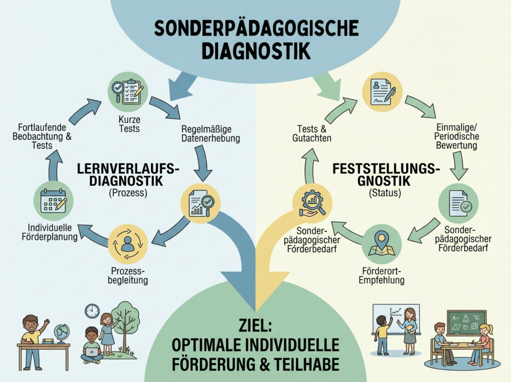 - Multiprofessionelle Zusammenarbeit: Die Diagnostik erfolgt oft in Zusammenarbeit mit verschiedenen Fachkräften, wie Sonderpädagogen, Lehrkräften, Schulärzten, Schulpsychologen und ggf. weiteren Experten.