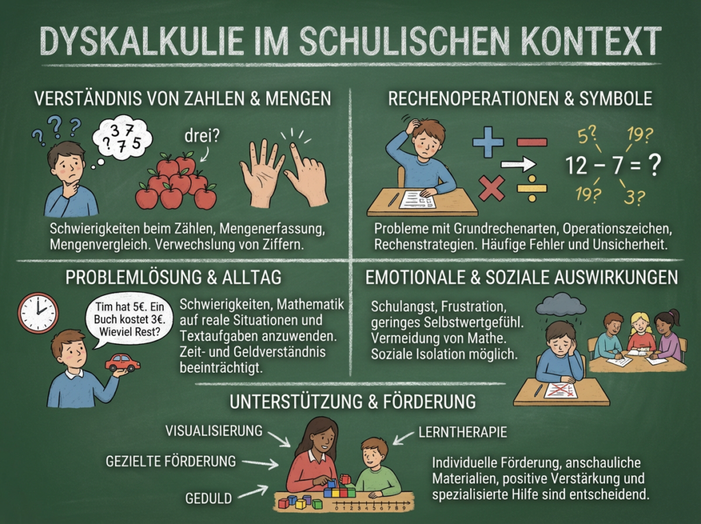 - Hier handelt es sich in der Regel um eine sogenannte Teilleistungsschwäche im Bereich der Rechenfertigkeiten. Die besuchte Schule kann auf Beschluss der Klassenkonferenz mit einem Lernplan reagieren, intensive Förderung oder Therapie ist angeraten, die mathematischen Grundvorstellungen und Lösungsstrategien der betroffenen Schülerin oder des betroffenen Schülers liegen erheblich unter dem Niveau der Jahrgangsstufe.